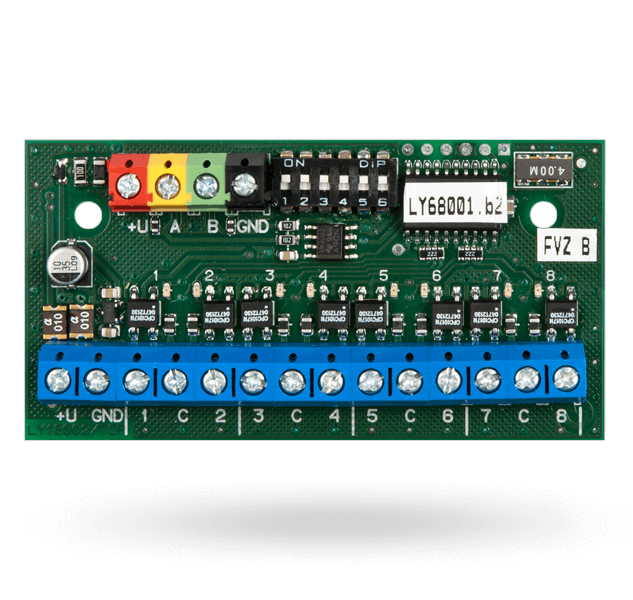 Module đầu ra 8 cổng cung cấp các đầu ra để phát tín hiệu báo động hiện trạng an ninh của tối đa 8 khu vực, phát tín hiệu đến các bộ báo động IW/EW[1] tại 8 khu vực hoặc về tình trạng của các đầu ra PG tại các khu vực đó. Module này được thiết kế để có thể lắp đặt bên trong hộp đa dụng JA-190PL hoặc bảng mạch DIN[2]. Các đầu ra của module này được cách điện với có dây. Module này được cài đặt bằng bộ chuyển mạch DIP[3]. Nó không được lắp trong hệ thống.
